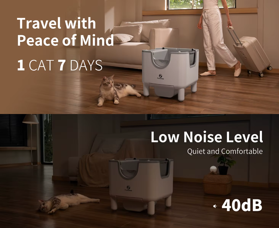 Our low-noise, self-cleaning system keeps the litter box fresh all week—so you can travel worry-free.
